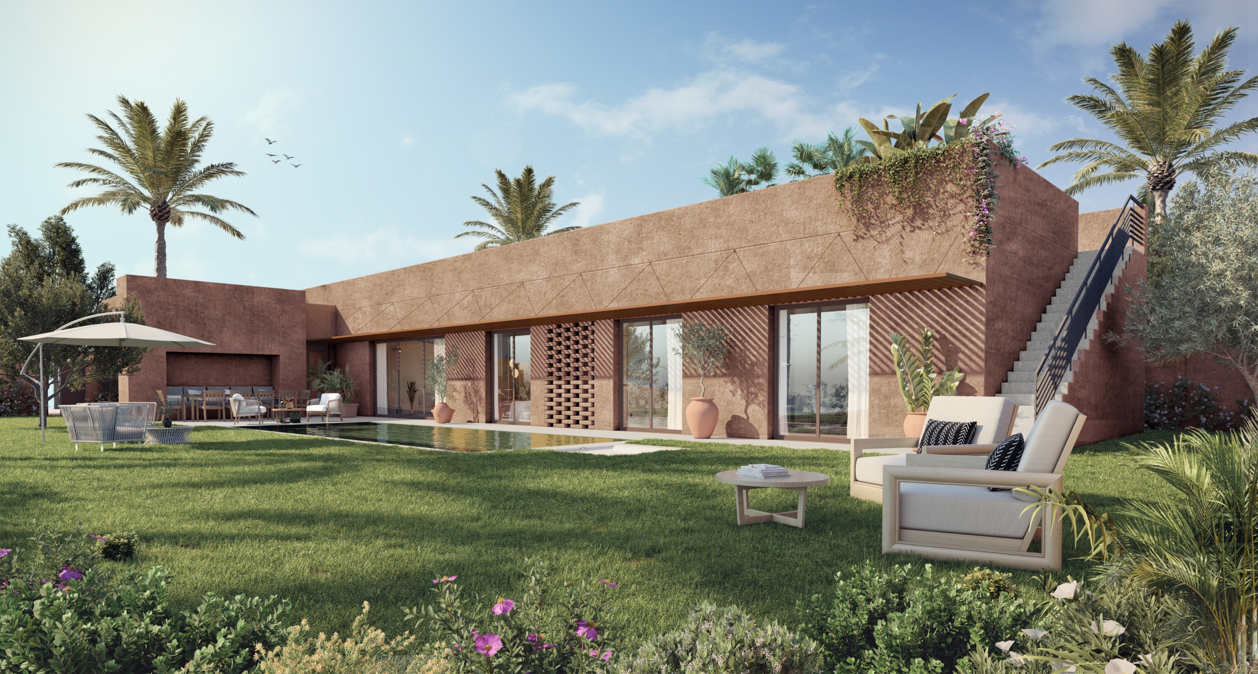 Au pied de l’Atlas et à 10 minutes de la médina, Maya propose des villas contemporaines ≈472–590 m² (constr.) avec piscine privative et jardins. Les volumes lumineux, les finitions haut de gamme et les espaces extérieurs généreux créent une atmosphère raffinée où l’on profite du climat marrakchi toute l’année.