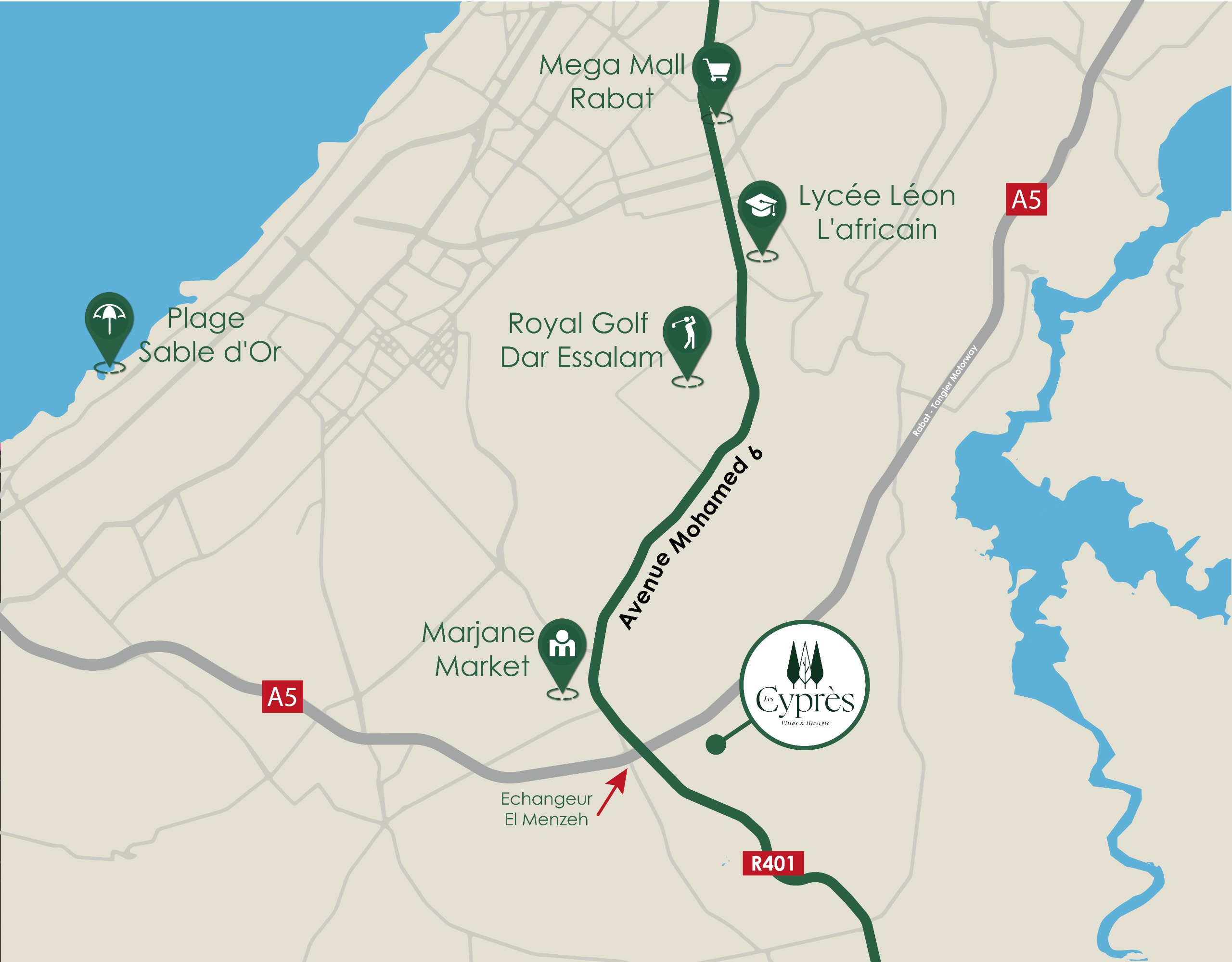 Au cœur du quartier résidentiel El Menzeh, le long de la route de Zaër, Les Cyprès offre un cadre exclusif, paisible et verdoyant, à proximité immédiate du Golf Dar Essalam. À seulement 20 minutes du centre de Rabat, la localisation conjugue tranquillité et connexions rapides aux écoles, commerces et zones d’affaires.